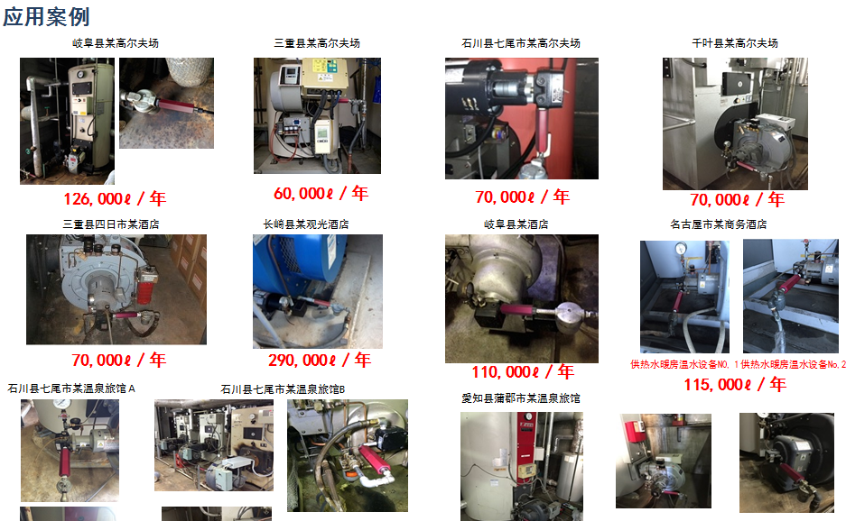 锅炉、船舶、燃油(气)直燃机、发电机组、动力机组、工业炉窖等。凡是以碳氢化合物(油、气)为燃料的燃烧设备,例如各类燃油(气)加热炉及大、中、小型燃油发动机等,均可安装在泵和燃烧室(汽缸)或喷咀之间。令它们使用的燃料在燃烧之前进行磁化裂解催化处理。
