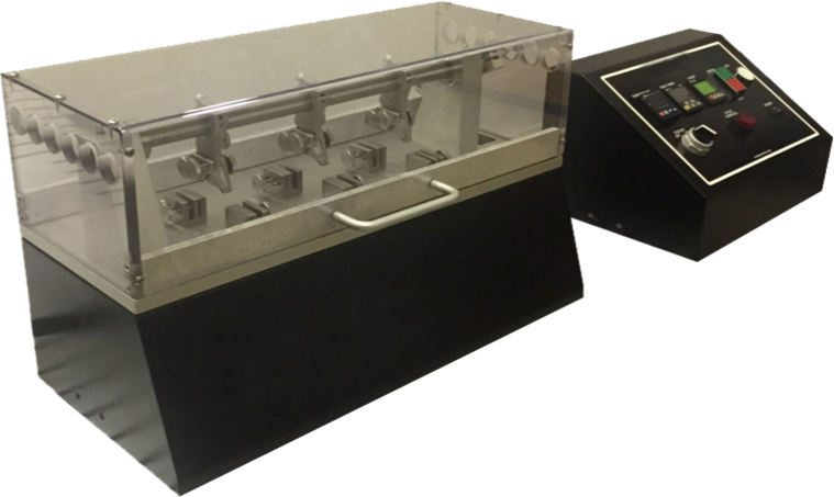 6工位Bally型低温挠度仪,站位面积小,在环境箱内占用的长度仅为22" (559 mm)。该设备用于评估皮革、复合材料、塑料、表面处理物和其他材料的耐弯曲疲劳性。多达6个样品可被折叠,固定在下夹具和上部振动夹具之间。每个运动周期对样品进行弯曲形成一条折痕,以评估样品的开裂倾向,类似于在行走中鞋子前端弯曲形成的折痕。