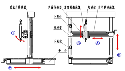 主要有主机框架,底平台(带纵横T型槽),滚珠丝杠、高精度负荷传感器,位移传感器、X方向和Y方向行程调节电机、松下伺服电机及减速机,施力方向调整装置等组成(见图1,图中所示X方向和Y方向为手动调节)。