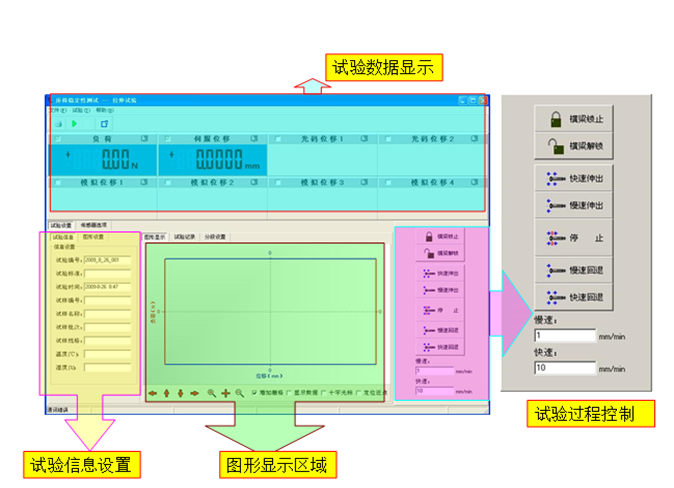 软件界面采用Windows环境下虚拟仪器技术,试验曲线采用模拟示波器显示方式。