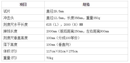 冲击头:冲击头就是用4根吊线在2000mm的地方悬垂直径为12.50±0.05mm、长约356mm、质量为0.35±0.01kg的铁棒。以从高100mm处落下的重力作为撞击能量,铁棒的打击端为半球面。