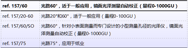 · 一般涂层和镜向磨光表面可用60°的测量,量程为0-1000个光泽单位(仅适合157/60和157/SO型)。