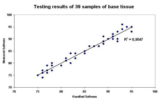 下图为对一组卫生纸原纸纸样的测试结果图,其中,纵轴为仪器测量的柔软度值,横轴为手感柔软度值。从此表看出,主观测得的柔软度值,和利用织物触感测试仪测得的柔软度值,两者的重复性/关联性非常好,证明了仪器测试法的可靠性。