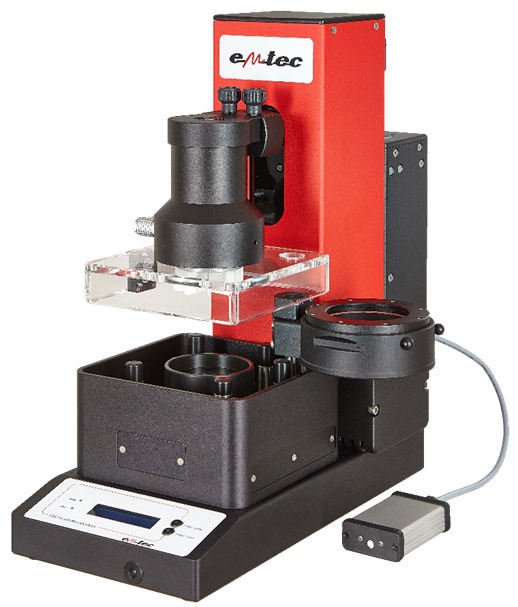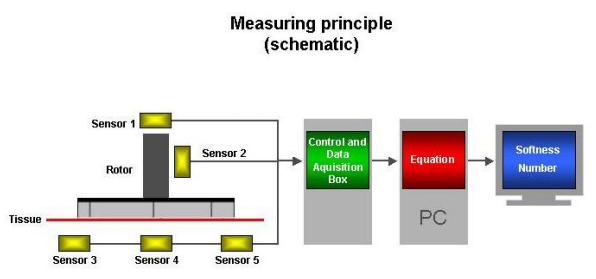 该新型的柔软度测量方法的具体工作原理如下:仪器的主要部件是一个转子、一个振动传感器和一些用于搜集另外数据和控制仪器功能的其它传感器。为了进行测量,转子压在试样之上,当转子达到最终位置时即开始旋转。转子和试样之间的相互接触使得试样产生振动。振动传感器接收到这些振动信号后,将其传递给分析组件。分析组件将预先准备好的数据传送给电脑。然后,电脑通过复杂的计算方式对这些数据进行处理。利用一个复杂的公式,通过同步测得的进一步参数和客户预先输入的参数(最大限度可以使用 68 个不同的参数),计算出柔软值。