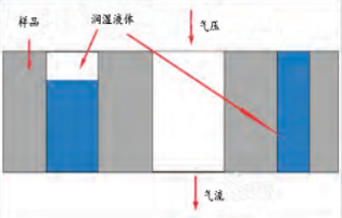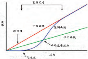 随着增加压差来测量通过干样品的惰性气体的流率,样品与湿润液体接触、液体自动填满样品上的孔、并且通过增加压差来测量穿过湿样品的流量,根据测得的压差和流率来计算孔结构特性。