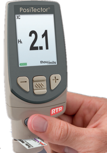 PosiTector RTR粗糙度测厚仪用来测量复制带(拓片纸)表面拓印形成的峰顶-谷地的高度,仪器测试简单方便,可单手操作,内置温度补偿以确保测量精度,重置功能可让使用者快速恢复出厂设置,仪器屏幕装有一块具有耐磨防腐蚀功能液晶显示屏并且外壳装有防撞击橡胶保护套,可防酸、防油、防水、防溶剂、防尘的有效保护仪器。