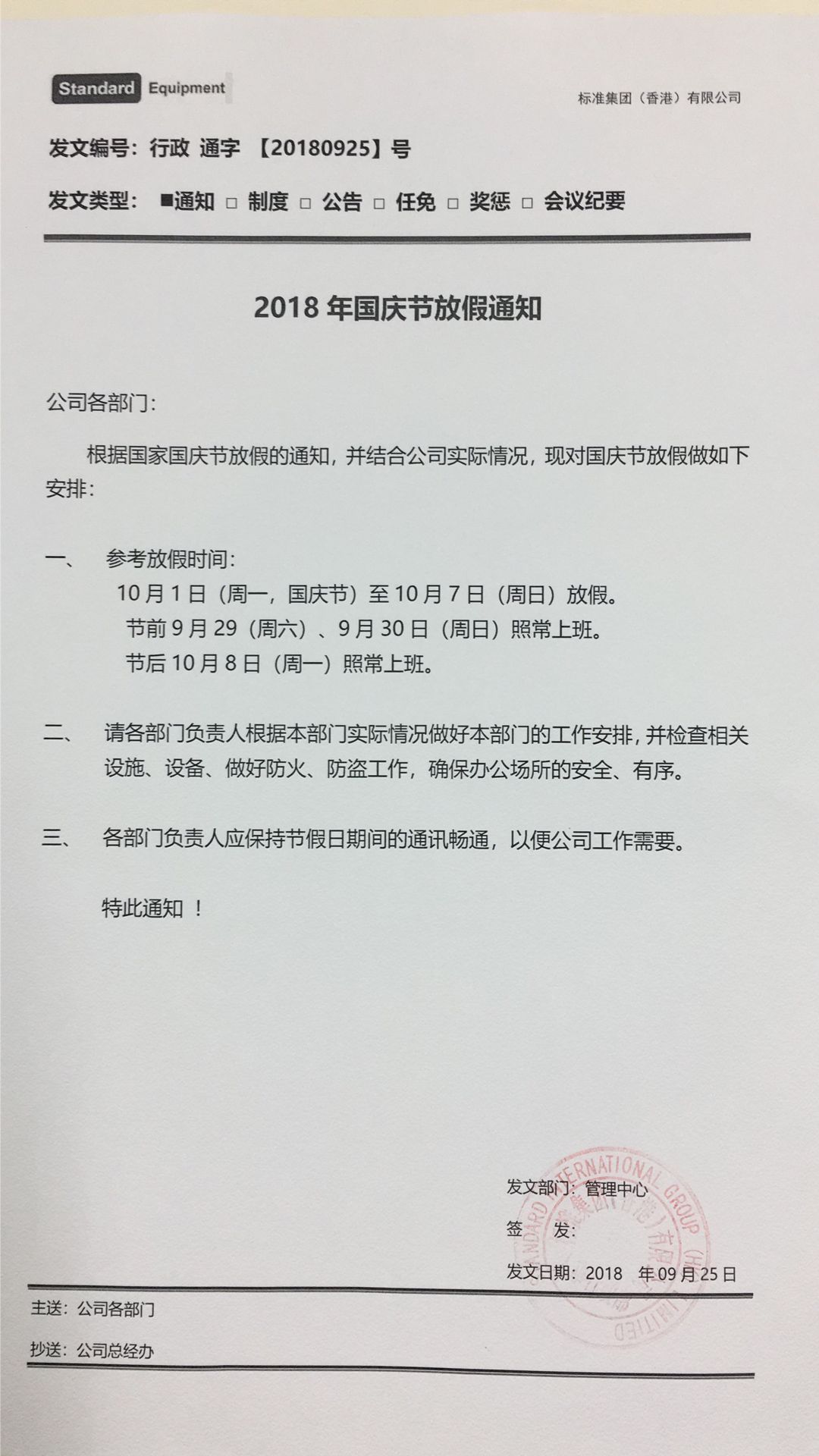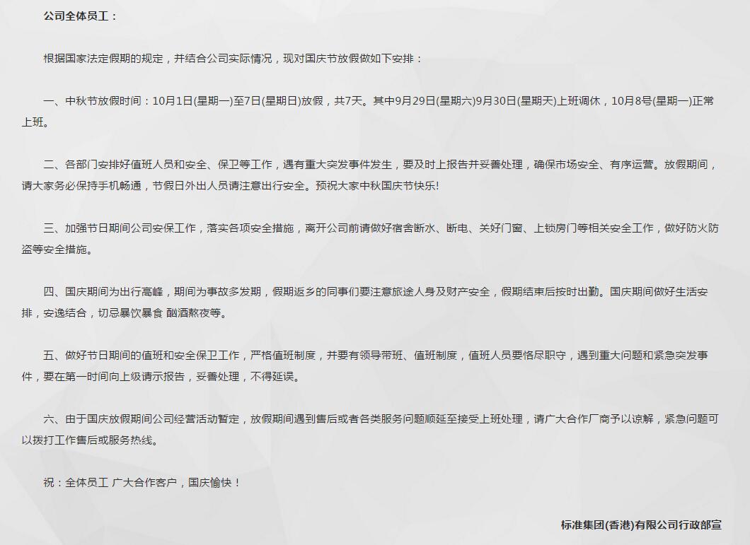 2018年标准集团国庆放假通知