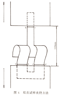 ②、双舌试样:如图4所示将试样的舌头夹在铗钳的中心且对称,使直线bc刚好可见。将试样的两长条对称地夹入仪器的移动铗钳中,使直线ab和cd刚好可见,并使试样的两长条平行于撕力方向。注意保证每条舌形被固定于铗钳中能使撕裂开始时是平行于撕力所施的方向。不加预张力并避免松弛现象。