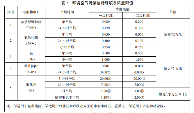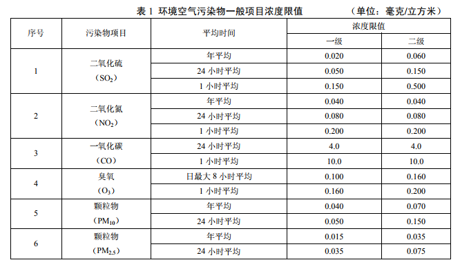 一类区适用一级浓度限值,二类区适用二级浓度限值。一、二类环境空气功能区质量要求见表 1和表 2。