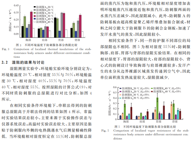 一般情况下,人体核心温度需要在37℃左右以保持舒适[2].防刺服作为人与环境间热量交换的重要介质,参与建立了人体 服装和服装 环境两个热交换环境.作为特殊防护装备,防刺服的隔热和传湿性能与一般服装有很大不同,多层基板往往会激发人体热应力,使警卫安保人员感到心理压力和生理疲惫[3],从而带来危险.因此研究防刺服的热湿传递性能有利于满足人体与环境间动态热平衡、实现人体 防刺服 环境系统的协调优、预防因热量堆积导致体能速降和穿着不适带来造成的危险.服装的热湿传递性能测试方法有主观评价法和客观测量法.主观评价方法偶然性较强,不同个体接受 认知 反应的差别导致测试结果存在较大差异.客观测量法通常通过测量服装热阻与湿阻,对其热湿传递性能进行评价.服装热阻表征了服装层两面的温度差与垂直通过服装单位面积的热流量之比,反映了服装的隔热保暖能力;湿阻表征了服装层两面的水蒸汽压力差与垂直通过服装单位面的蒸发热流量之比,反映了服装的透湿能力[4].
