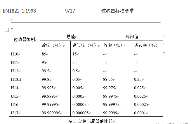 高效过滤器一般只标定过滤器的总效率,如过滤器铭牌上标定果粒橙效率99.97%,即为该过滤器的总效率。图3是标准《EN1822》中列出的不同级别过滤器的总值与局部值之间的数值。局部值是指在过滤器下方进行逐点扫描得出的效率,总值是逐点扫描后取算术平均值得到的,图3中局部值的数值是以MPPS(易穿透粒径)进行计数的。
