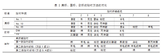 3种标准的贴衬组成详见表2。从表2可知,美标的贴衬主要有No.1、No.10、No.493种。3种贴衬纤维组