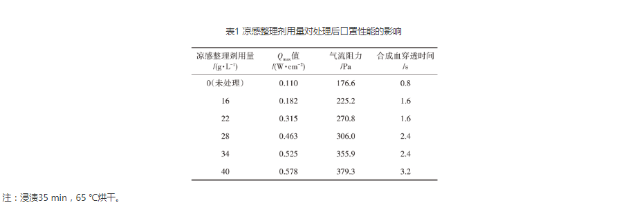 本研究对医用一次性无纺布口罩的内侧无纺布进行凉感整理,即运用凉感整理剂(配制成整理液)对该类口罩的内侧无纺布进行浸渍处理,以接触凉感值(Qmax值,即织物大热流失量,单位为织物瞬间凉感热流量,W/cm2)、气流阻力、合成血穿透时间(喷射直至渗透时间)为衡量指标,结合GB 19083—2010《医用防护口罩技术标准》的要求,探讨了凉感整理剂用量、浸渍时间、烘干温度对上述指标的影响,并拟定佳工艺方案。
