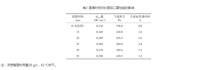 由表2可知,随着浸渍时间的延长,处理后口罩的Qmax值逐步增大,气流阻力逐步增大,合成血穿透时间由0.8 s 延长至3.2 s;但当浸渍时间超过35 min后,Qmax值、合成血穿透时间趋于稳定。原因在于开始时凉感整理剂发挥作用明显;浸渍一段时间后,织物上的凉感整理剂接近饱和。故浸渍时间选择35 min。