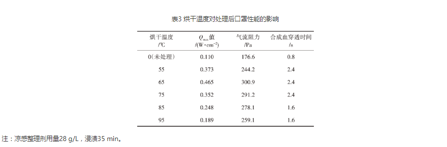 由表3可知,随着烘干温度的上升,处理后口罩的Qmax值、气流阻力和合成血穿透时间均呈现先增大后下降的趋势。原因在于烘干温度上升,凉感整理剂作用明显,但温度越高,凉感整理剂蒸发越快。烘干温度选择65 ℃为宜。