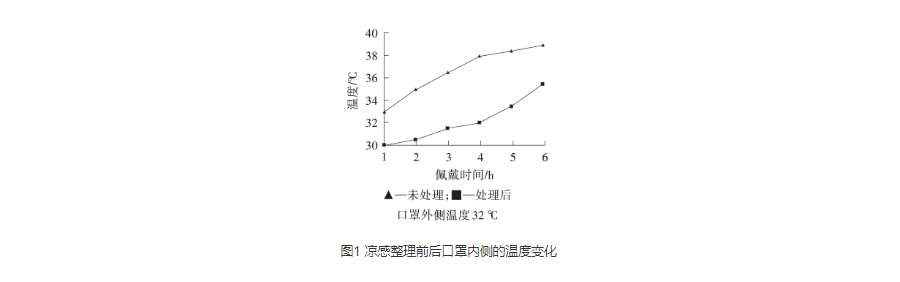 上述报道均未探讨口罩的凉感整理。凉感全称为“接触瞬间凉感”,通过热传导将温度由高温处传导到低温处,直至平衡[11]。目前,市场上的凉感整理剂多为高级脂肪烃和凉爽因子,相变温度略低于体表温度,一般为31~32 ℃,给人以凉爽的舒适感,同时对皮肤无刺激性、无过敏性等不良反应[12]。通过凉感整理可以改善口罩长时间佩戴闷热的问题,保持口鼻凉感和干燥。