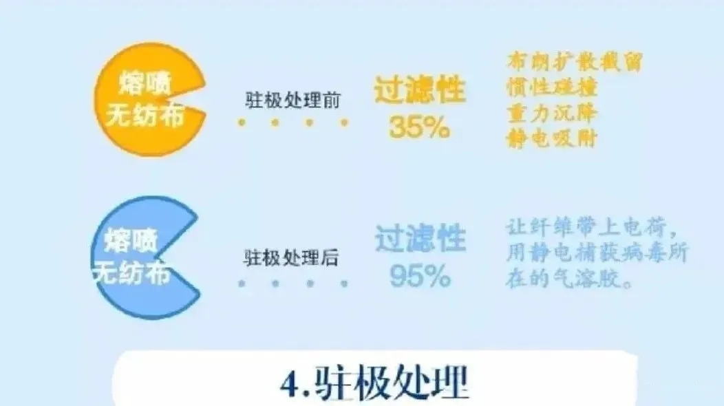 熔喷无纺布本身的过滤性能其实只有70%以下的,纯粹靠熔喷超细纤维的纤维细、空隙小、孔隙率高的纤维三维集合体的机械阻挡作用是不够的。不然,一味增加材料克重厚度反而会大大增加过滤阻力。所以熔喷过滤材料普遍都是会通过静电驻极的工艺对熔喷布进行添加静电电荷效应,利用静电的方法提升过滤效率,可以达到99.9%到99.99%。也就是达到N95标准或以上。