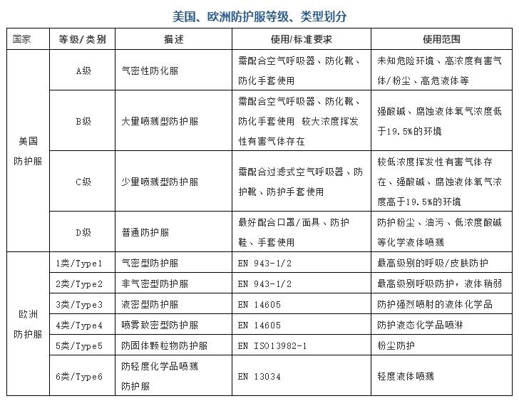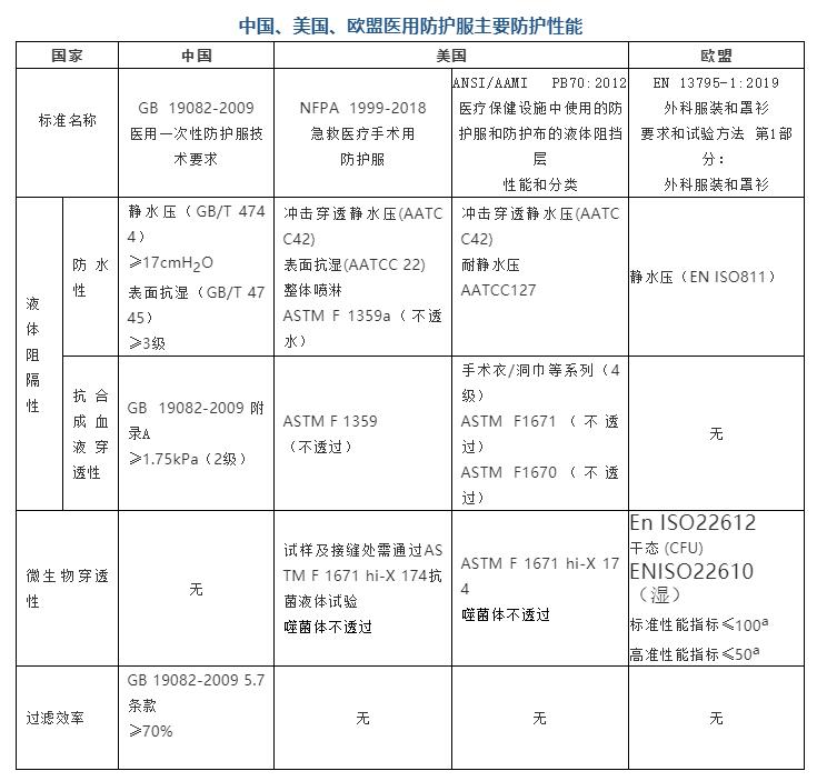 防护服的“防护性能”是为重要的性能要求,主要包括液体阻隔、微生物阻隔和对颗粒物质的阻隔等方面。目前国际上较通用的医用防护服标准是美国NIOSH(美国国家职业安全卫生研究所)标准和欧盟的EN标准。下面就主要国家医用防护服标准中的防护性能进行简单比对。