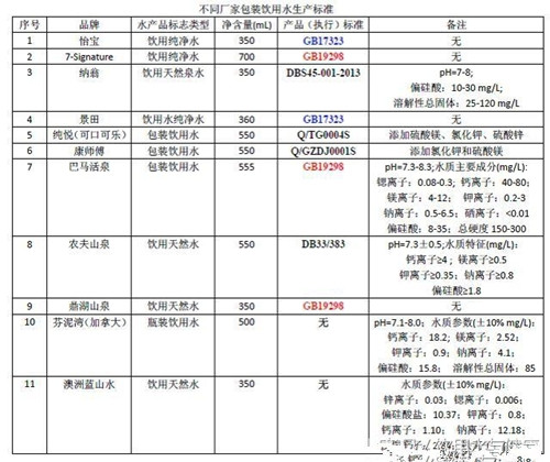 为保证直饮水的安全和优质,科学且严谨的国家标准必不可少。在家附近的超市中买来各种瓶装水,对比各种产品的生产基准后发现,虽然天然矿泉水的生产基准一致,均参照国标GB8537的标准,然而11种不同包装饮用水产品中,所依据的标准居然多达6种,还有两种进口水没有产品标准,可见非常混乱(详见下表)。