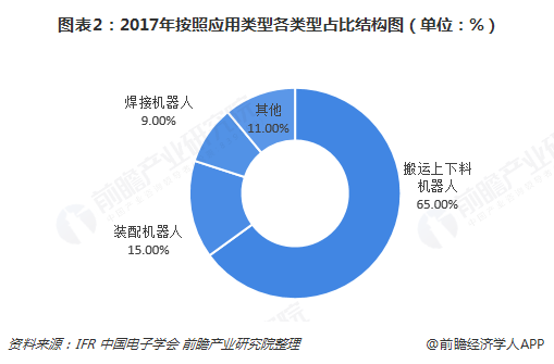 2017年,中国工业机器人保持高速增长,销量同比增长30%。按照应用类型分,2017年国内市场的搬运上下料机器人占比高,达65%,其次装配机器人,占比15%,高于焊接机器人占比6个百分点