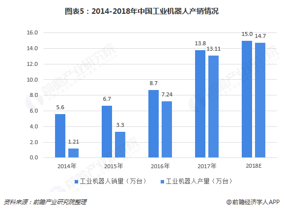 中国工业机器人市场近年来快速发展,已经成为全球大工业机器人应用市场,约占全球市场份额的三分之一。2017年中国工业机器人产销量均创下新记录,产量为13.11万台,同比增长81.1%,销量为13.8万台,同比增长58.6%,增速同比全球工业机器人销量增速31%,高出27.6个百分点。根据前瞻产业研究院发布的《2019-2024年中国工业机器人行业发展前景与投资预测分析报告》随着中国智能制造政策推进,制造行业智能化改造升级加快,工业机器人需求量将日益增长。