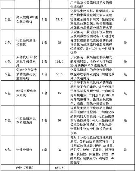 公告显示,本次采购预算为651.6 万人民币,一共8包,设计的一起包括发用化妆品全自动体外测设系统、高灵敏度XRF重金属检测仪、化妆品刺激性检测仪、人体皮肤4D快速光学成像系统、荧光/化学发光多功能微孔板检测系统、化妆品快速无菌检测系统、物质分析仪等,大部分允许进口。