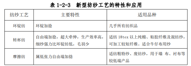 传统的环锭纺仍占主要地位,但新型纺纱如转杯纺、喷气涡流纺等的应用比例在逐步增大。主要新型纺纱工艺的特性和应用见表 1-2-3。