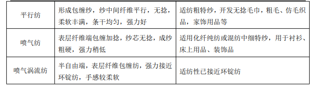 新型纺纱工艺与环锭纺工艺相比,纺纱速度高 5~12 倍。工艺流程短,生产效率高,成本低等优点,但成纱强力较低,产品有一定特色,用途不如环锭纺那样广泛。