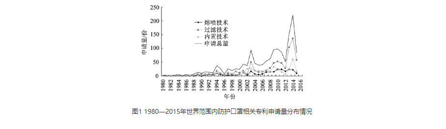 在确定了防护口罩的技术类型、检索用分类号和关键词后,我们在国家知识产权局中国专利文献检索系统数据库(CNPAT)、国家知识产权局S系统的世界专利文摘数据库(SIPOABS)和德温特世界专利数据库(DWPI)中,以上述分类号和关键词进行检索,检索对象限定为全球公开日或公告日在1980—2015年(本文数据截至2015年4月30日)间的发明和实用新型专利申请。图1显示了世界范围内防护口罩的申请量。