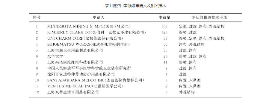 根据申请量分析,并结合前期统计结果,对上述防护口罩领域的申请量较多的申请人或行业内比较知名的企业申请人进行排序,如表1所示,数据统计时间段同2.2节。