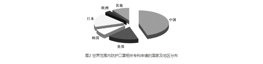 世界范围内防护口罩相关专利申请的国家及地区分布见图2,数据统计时间段同2.2节。由图2可知,在防护口罩相关的专利申请中,中国专利申请数量多,其次是美国和日本,世界其他国家的申请总量也占据相当比例(由于其他国家分布较为庞杂,此处不再细分)。总之,包括中国、日本、韩国的亚洲国家的申请量占据了全球申请量的绝大部分,美国的申请量仅次于亚洲。